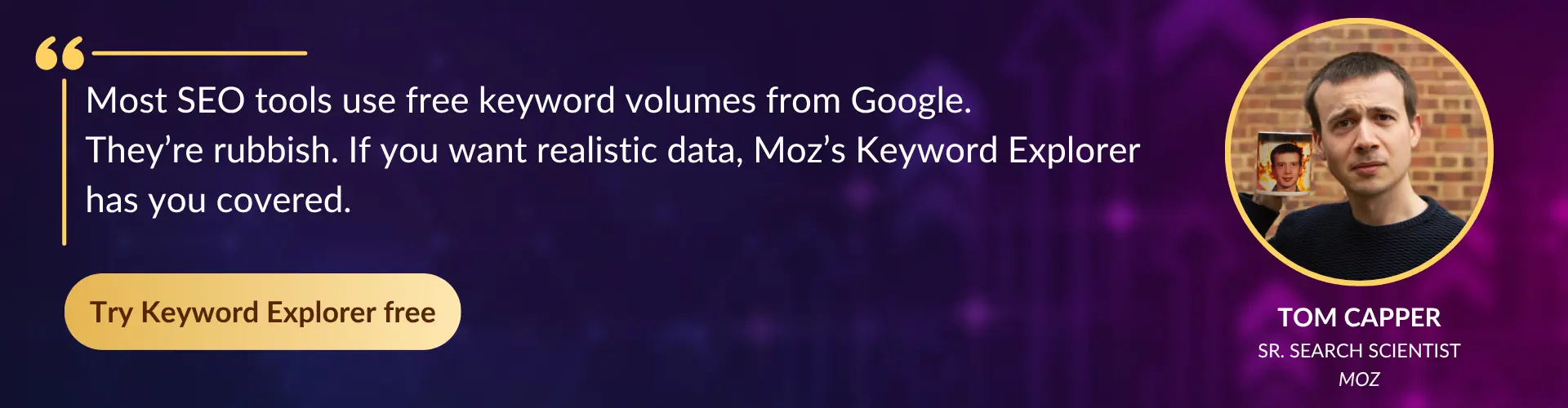 - Moz Keyword Explorer - Input a keyword in Keyword Explorer and get information like monthly search volume and SERP features (like local packs or featured snippets) that are ranking for that term. The tool extracts accurate search volume data by using live clickstream data. To learn more about how we're producing our keyword data, check out Announcing Keyword Explorer.
