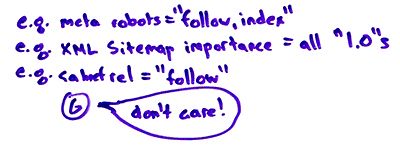 So when Google crawls a site, when they come to a site, if you don't have a robots.txt file, or you have a robots.txt file but it doesn't include any exclusions, any disallows, or they reach a page and it has no meta robots tag, they're just going to assume that they get to crawl everything and that they should follow all the links.