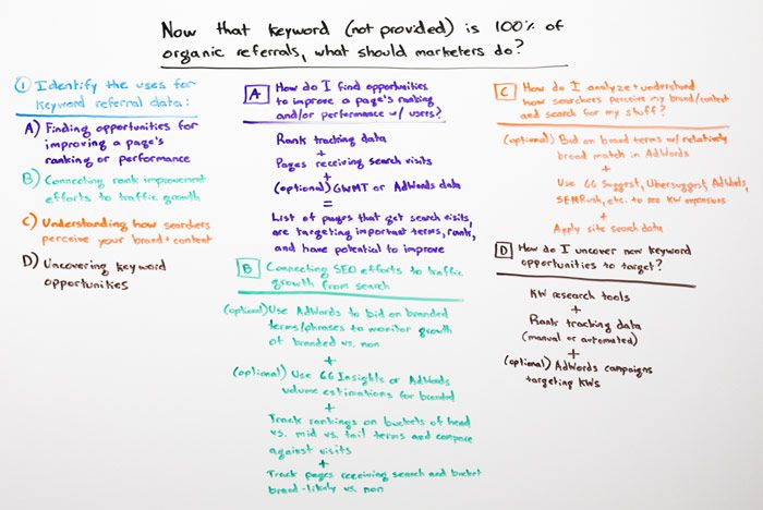 Howdy, Moz fans, and welcome to another edition of Whiteboard Friday! Today I'm going to talk about this extremely troublesome and worrisome problem that Google has expanded "keyword (not provided)" potentially to 100% of all organic referrals. This isn't necessarily that they've flipped the entire switch, and everyone's going to see it this week, but certainly over the next several months, it's been suggested, we may receive no keyword data at all in referrals from Google. Very troubling and concerning, obviously, if you're a web marketer.