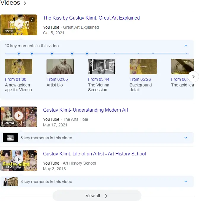 The example above is pretty simple, with the exception of “Key Moments” (which debuted in 2019), but even the familiar video packs can get pretty complex. Here’s one from a search for the artist Gustav Klimt: