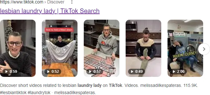 Finally, Google has started to display a special format for TikTok videos, that typically includes a selection of five videos that preview when you hover over them. Here’s an example from one of my favorite TikTok personalities: