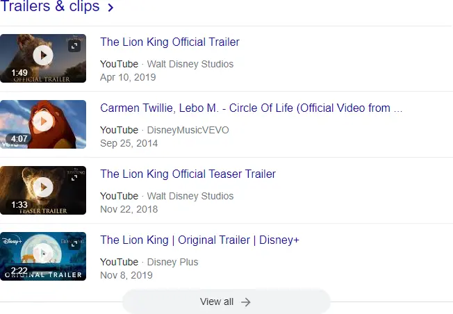 All three of the videos here have Key Moments, including a pre-expanded section for the top video with thumbnails for each of the moments. Some specific SERPs also have minor variations, such as the “Trailers & clips” feature on this search for “Lion King”: