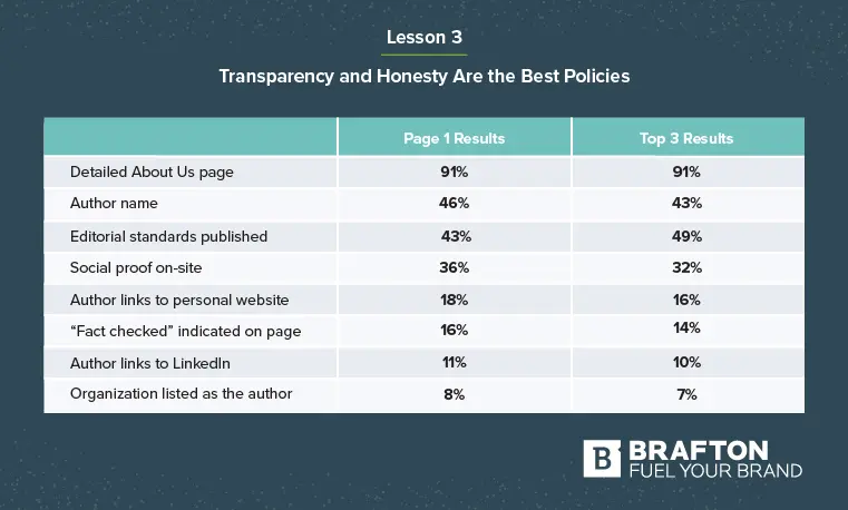 To see a detailed explanation of each factor considered in this study, check out the full E-A-T study report on the Brafton blog.