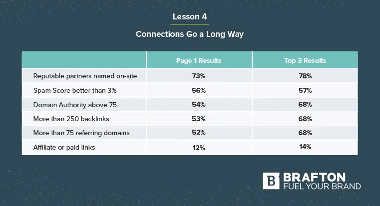 The average number of referring domains among Page 1 results was 752. Meanwhile, among the Top 3 results, the average was 1,594. Making connections with other organizations online by way of honest link-building efforts can be one way to expand your reach, but also show Google and other search engines that you offer quality, worthwhile content.