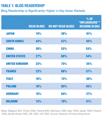 It's not surprising for most Internet users to find that influencers of all varieties are heavily engaged with the web in general (and the blogosphere in particular), but it's amazing to imagine that US influencers are actually trailing countries like China, South Korea, & Japan in blog engagement.