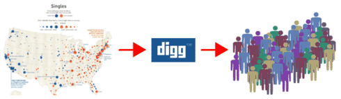 In the example above, this singles map, showing the distribution of cities in the US with high/low men-to-women ratios, was "spread" across the web after it was promoted on Digg. The content's creator, National Geographic magazine, hadn't enabled the map to be visible in an online format, so the owner of a dating website actually re-published the image and built up a considerable amount of mindshare and relevant links.
