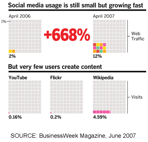 The chart above shows that year over year, 2007 was a breakout for user-generated content and participatory sites. The bottom half tells the story of opportunity - social media marketers have an opportunity to contribute and shape the social web before the noise of millions of users makes a single voice impossible to hear.