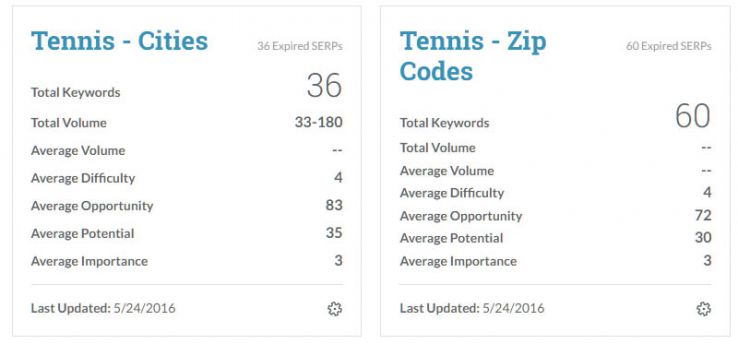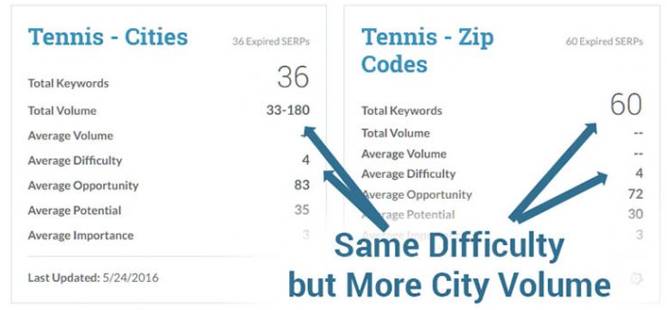 Finally, we compare the metrics of the two groups of keywords. In this case, while there was similar keyword difficulty, there was slightly more traffic available when using the city rather than the zip code.