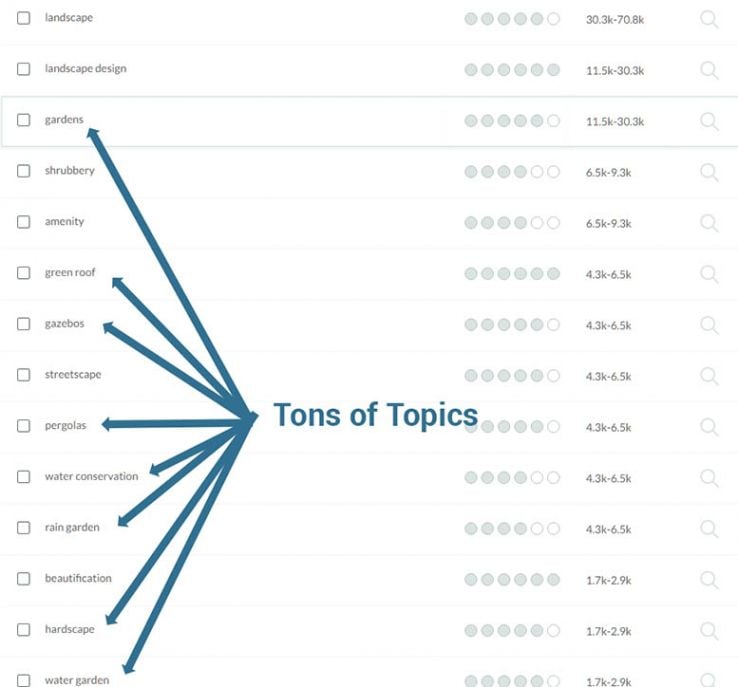 Just run through the list and try to pick out a handful of general topics. In this case, from the word "landscaping" we were able to select "gardens," "green roof," "gazebos," "water conservation," "pergolas," "rain garden," "hardscape," and "water garden." Notice that all these great topics showed up in just the top 20 options. We could easily find dozens more just by scrolling down the list.