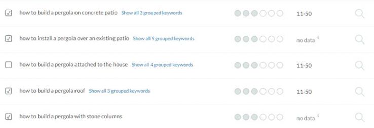 Questions make for easy writing prompts, and questions that actually get traffic are even better! Copy and paste each keyword, one at a time, into Keyword Explorer. From the same filter drop-downs choose "Are Questions" and "Group by Medium Lexical Similarity." You can fool around with the lexical similarity metric to have tighter or looser groupings. If you use the word "pergola," as we did in the example below, you will find several questions that are directly related to the topic and, importantly, are representative of several terms. For example, the question "How to Build a Pergola over an Existing Patio" is actually representative of 9 terms, which means writing on this topic will give you a good chance to rank for several terms, rather than just one.