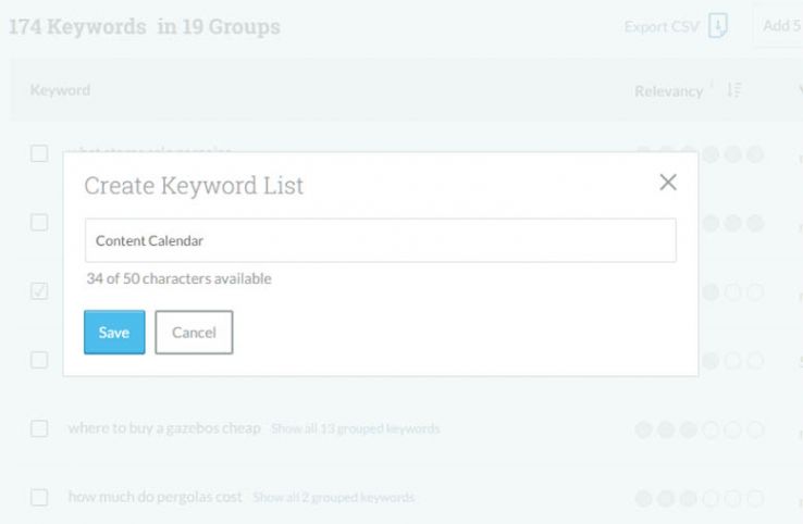 Pro tip: Group your keywords into topic-specific lists, so you can compare the keyword metrics at a topic level as well.