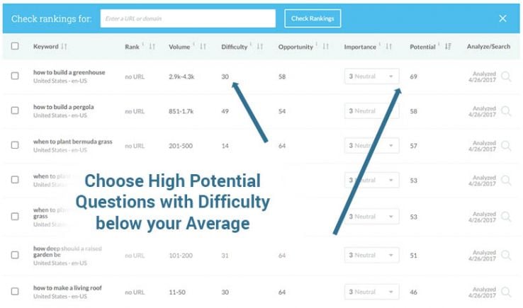 Always remember your original average keyword difficulty number. This is hugely valuable in scoping out your content calendar because you can easily exclude writing prompts that are too competitive. Click into your list in Keyword Explorer and sort by potential, remembering to ignore those with a keyword difficulty higher than your average keyword difficulty.