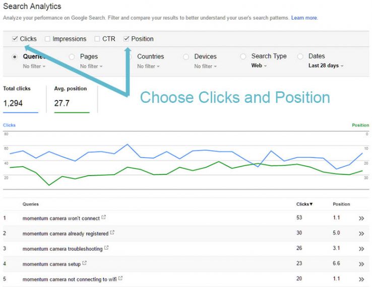 I know some of you are already thinking — hey, Russ, didn't you just write an exposé on how this data in Google Search Console is unreliable? Well, yes, I did. So what? Sometimes you have to work with what you've got. In this case, Google Search Console actually happens to provide more than sufficient information for us to accomplish our goal. The first step is to order your Queries in Search Console by Clicks and choose to show Position as well.