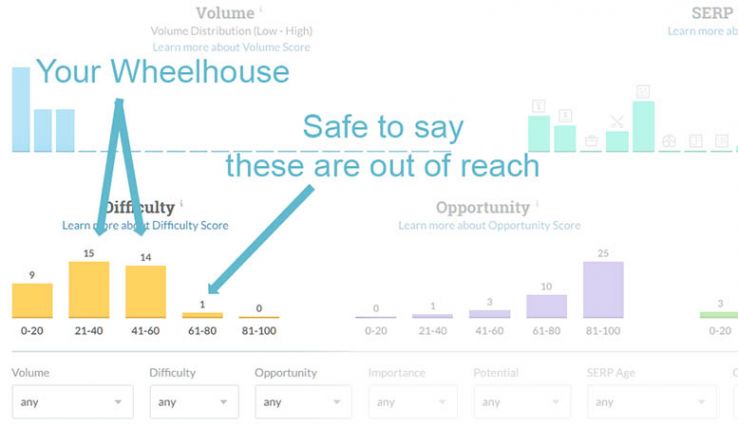 Now that your list is complete and Keyword Explorer has finished building your report, you have great data with which to work. You can look at the summary statistics to get an idea of the average keyword difficulty, but I prefer to use the charts. If you look at my example below, it seems like most of my keywords fall in the 21–40 range, and a handful in the 41–60, but there is a stark drop-off in the 61–80. If I imagine a curved line connecting the bars in the chart, I can see that it probably peaks somewhere around the 35–40 range, which is likely the highest I should regularly target for keywords.