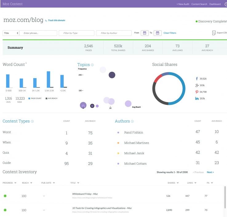 The filtering lets you segment content to easily surface insights about your current strategy. Are "social media" or "link building" articles generating more links? How do Whiteboard Fridays compare with other videos? Audits let you shortcut the analysis and answer pressing questions about your audience's interests.