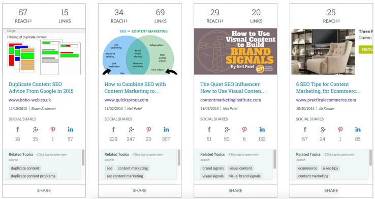 Content Search lets you explore popular articles from across the web with simple topic searches. Interested in SEO and content? A quick search for (no surprises here) "SEO AND content" surfaces competitor articles that have garnered lots of attention.