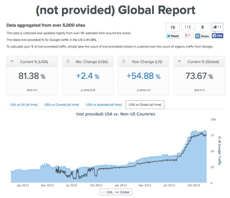 The (not provided) Global Report aggregates data from over 5000 websites to display near real-time reporting of Google's (not provided) keywords worldwide.