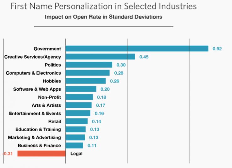 One of our favorite email providers, MailChimp, recently studied email subject line open rates. This graphic explores the effect of including a subject's first and last name across various industries.