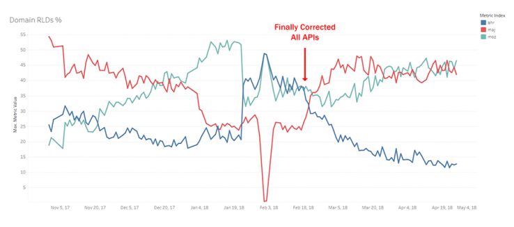Simple, right? No, even this metric has its nuances. What is a root linking domain? Do subdomains count if they are on subdomain sites like Blogspot or Wordpress.com? If so, how many sites are there on the web which should be treated this way? We used a machine learned methodology based on surveys, SERP data, and unique link data to determine our list, but each competitor does it differently. Thus, for this metric, direction really matters. As you can see, Moz has been steadily catching up and as of writing today, Moz is finally winning.