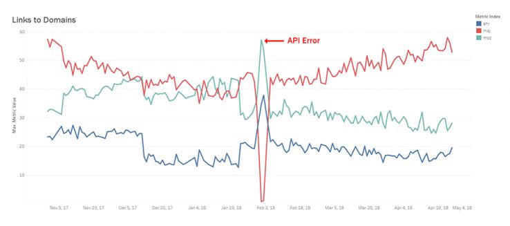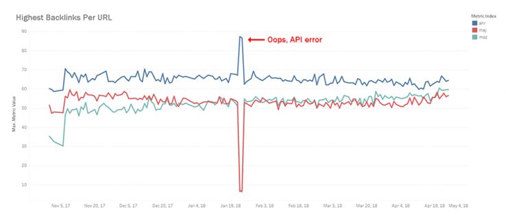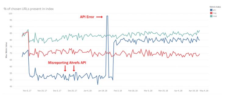 - Some metrics are hard to estimate, especially like "whether a link is in the index," because no API — not even Moz — has a call that just tells you whether they have seen the link before. We do our best, but any errors here are on the API provider. I think we (Moz, Majestic, and Ahrefs) should all consider adding an endpoint like this.