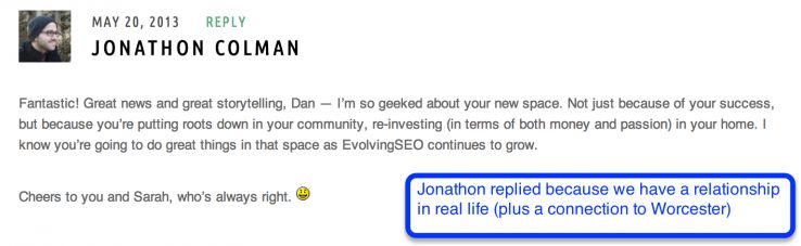 Lots of people who comment on my company blog are colleagues or friends. Here is a personal example;