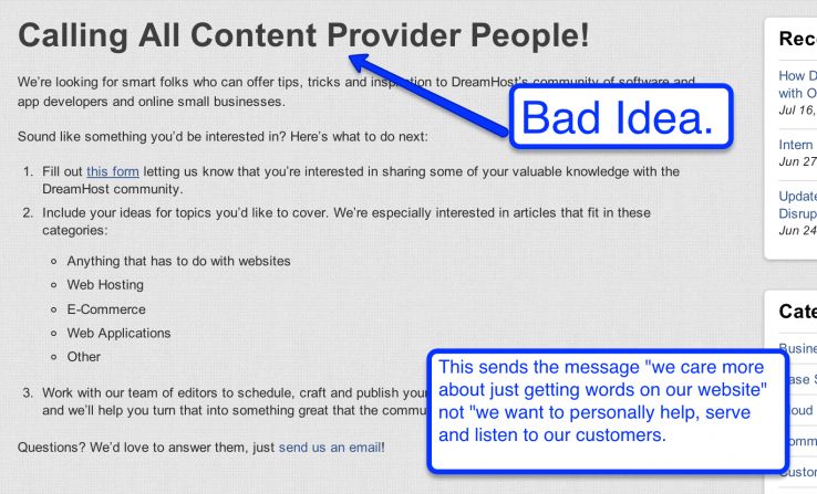 And the variation I hear to this is "blog posts are where you throw all of your keywords. Over and over. " WRONG! Blogging does not automatically help SEO. (Granted this myth may have been slightly more true pre-Panda, but still wasn't a good strategy).