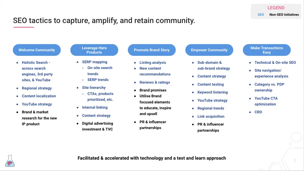 The community flywheel outline by McKinsey & Company succinctly explains how brands can build better communities, which in turn builds a better brand. It’s a five-step process underpinned by technology that enables scale and a test-and-learn approach that delivers consistent improvement. To align SEO initiatives for each of the 5 steps, I’ve created this graphic showing how initiatives apply to each step.