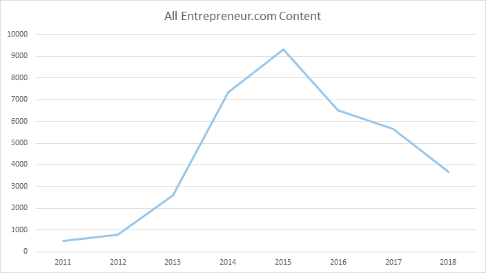 Another important data point I wanted to look at was the amount of content being published overall. Without this info, there would be no way of knowing if, with content quality improving all the time, journalists were spending a significantly more time on posts than they had previously while publishing at diminishing rates. To this end, I looked at how much content Entrepreneur.com published each year over the same timeframe: