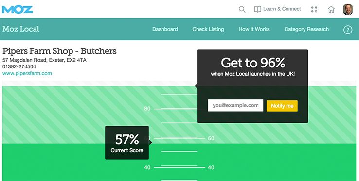You've no doubt noted in the screenshot above that we project a listing score improvement. We do plan to release a fully-featured U.K. version of Moz Local later this spring (with the same distribution, reporting, and duplicate-closure features that are available in the U.S.), and you can enter your email address—either on that page or right here—to be notified when we do!