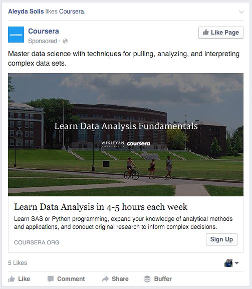 On social platforms, this takes the form of “promoted” posts — including stories or videos in your Facebook stream or tweets in your Twitter stream from brands you didn’t explicitly follow or “Like.” See, for example, this Coursera ad in my Facebook stream: