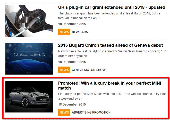 For publishers, native advertising looks more like brand content presented as whole pages rather than as banners or advertising around the edges of the regular content. It can take the form of creative content promoting the brand, brand-funded “advertorial,” or anything in between. See, for example, this well-labelled advertorial on Autocar: