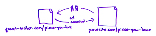 Without forcing them to remove the content from their site, so saying you, publisher, you author can keep it on your site. We don't mind. We'd just like this tag applied, and we'd like to able to have republishing permissions on our website. Now you can get the SEO benefits of that piece of content, and they can, in exchange, get some money. So your site sending them some dollars, their site sending you the rel=canonical and the ranking authority and the link equity and all those beautiful things.