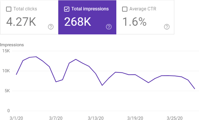 If traffic has dropped, but rankings haven't, it's also possible that the behavior of searchers has changed. We can get some insights into this by using Google Search Console. Here's the graph of total clicks for our example site from March 1-28 (corresponding with the GA data) ...