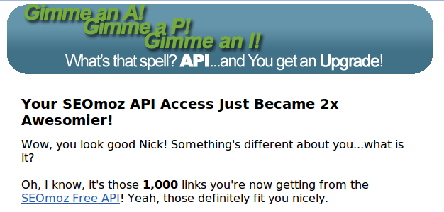 I know, I promised a Linkscape update by last week. And I missed it. But there's an update today! Do you forgive me? No? Not enough? Well how about doubling the volume of data available in our free API? You might have gotten a totally awesome email last week announcing that the free SEOmoz API is now serving up to 1,000 links. This email was so awesome I just had to share it (nice work Scott!)