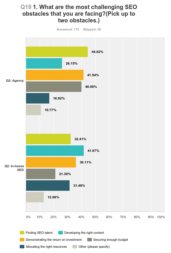 If we look at the top three obstacles faced by agencies and in-house teams, both of them place finding SEO talent up there. Both groups also say that demonstrating ROI is an issue, although it’s more of an obstacle for agencies rather than in-house SEO teams.