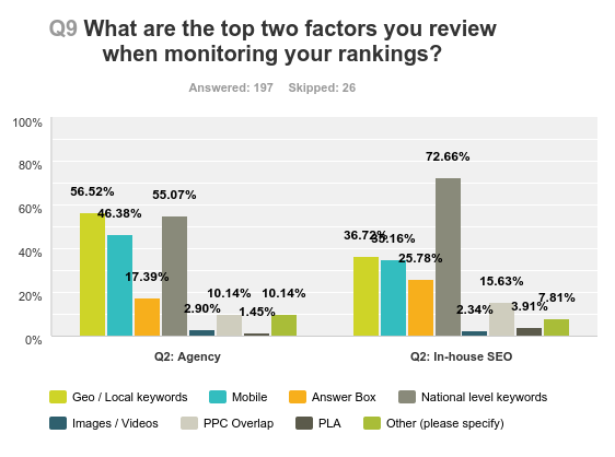 Looking at the “Other” responses (free response), we had several write-ins from both subgroups who answered that traffic and leads were important to them. One agency survey-taker brought up a good point: that what they monitor “differs by client.” We would be remiss if we did not mention the importance of vertical-specific and client-specific approaches — even if you are working in-house, and your only client is your company. From this angle, it makes sense that everyone is measuring rankings and SEO differently.