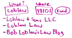 So for this one, you just put in a portion of the business name. Bob's business is Bob Loblaw's Law Firm. Instead of just putting the whole thing in, we'll just put in Loblaw to help surface variations. Here are some variations that might come up. We've got Loblaw and Sons LLC, Loblaw's Law, and Bob Loblaw's Law Blog.