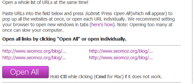 I use this all the time when checking guest post or press coverage. Rather than going to each website one by one, I copy all the URLs, dump them into this tool and press go. Each site will then be opened in a new tab.