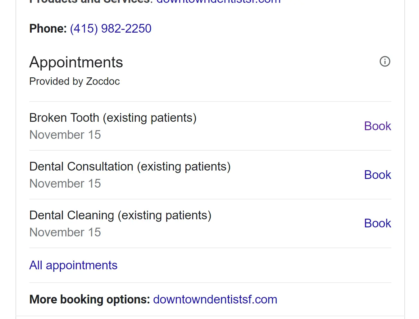 Businesses can feature several different booking and appointment functions on their listings, powered by a provider. For example, this instance on the listing of a dental practice stems from ZocDoc: