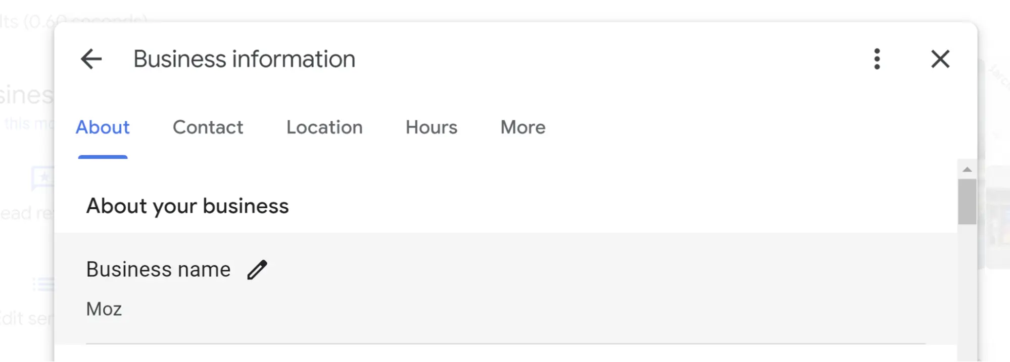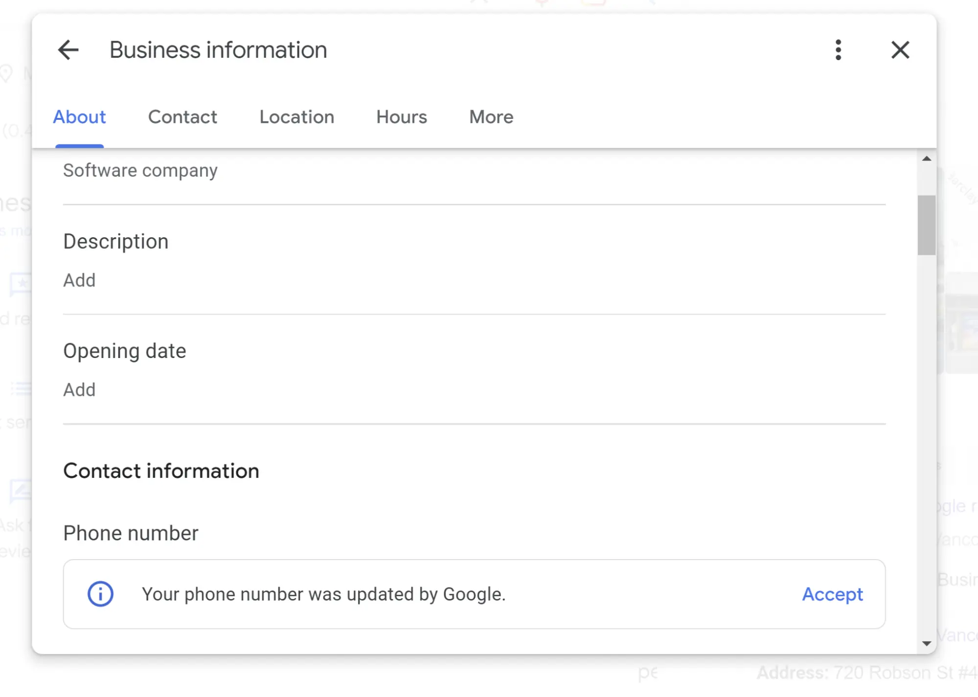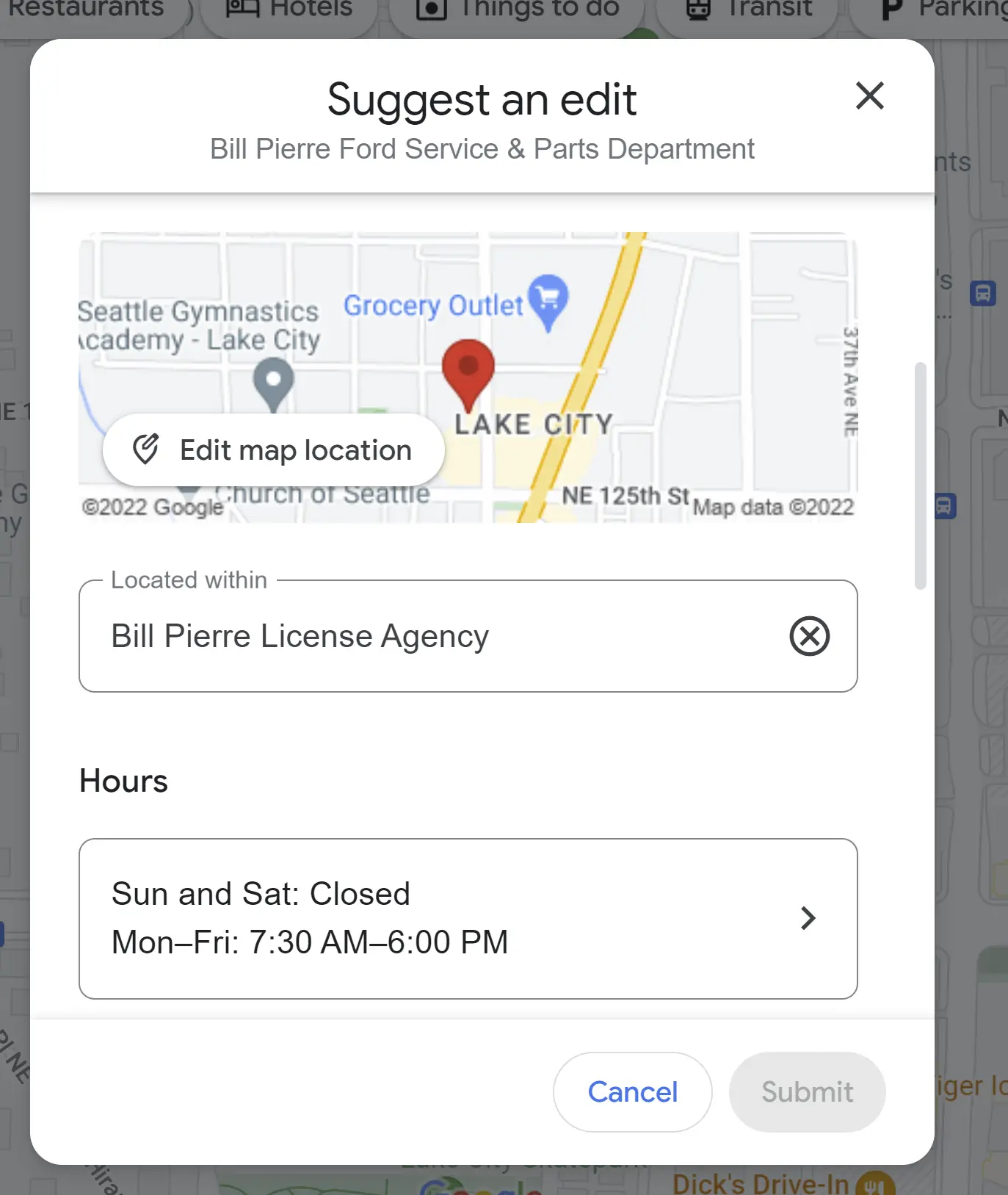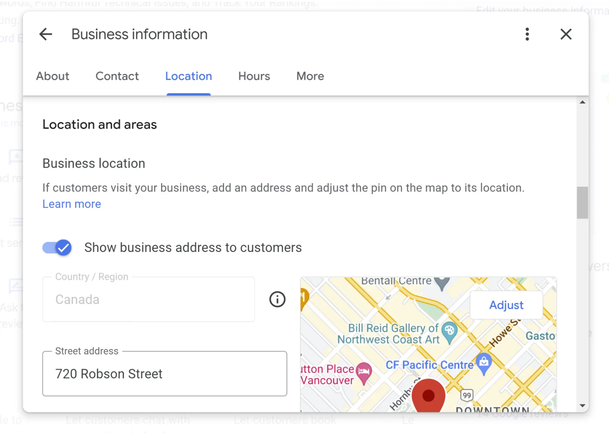 Partly — the information about your province or county relates to the physical address you provide, but the separate “located in” feature can only be edited via Google Maps. If you wish to edit this feature, find your listing on Google Maps, click the “suggest an edit” button, and look for the “located within” area of the editor: