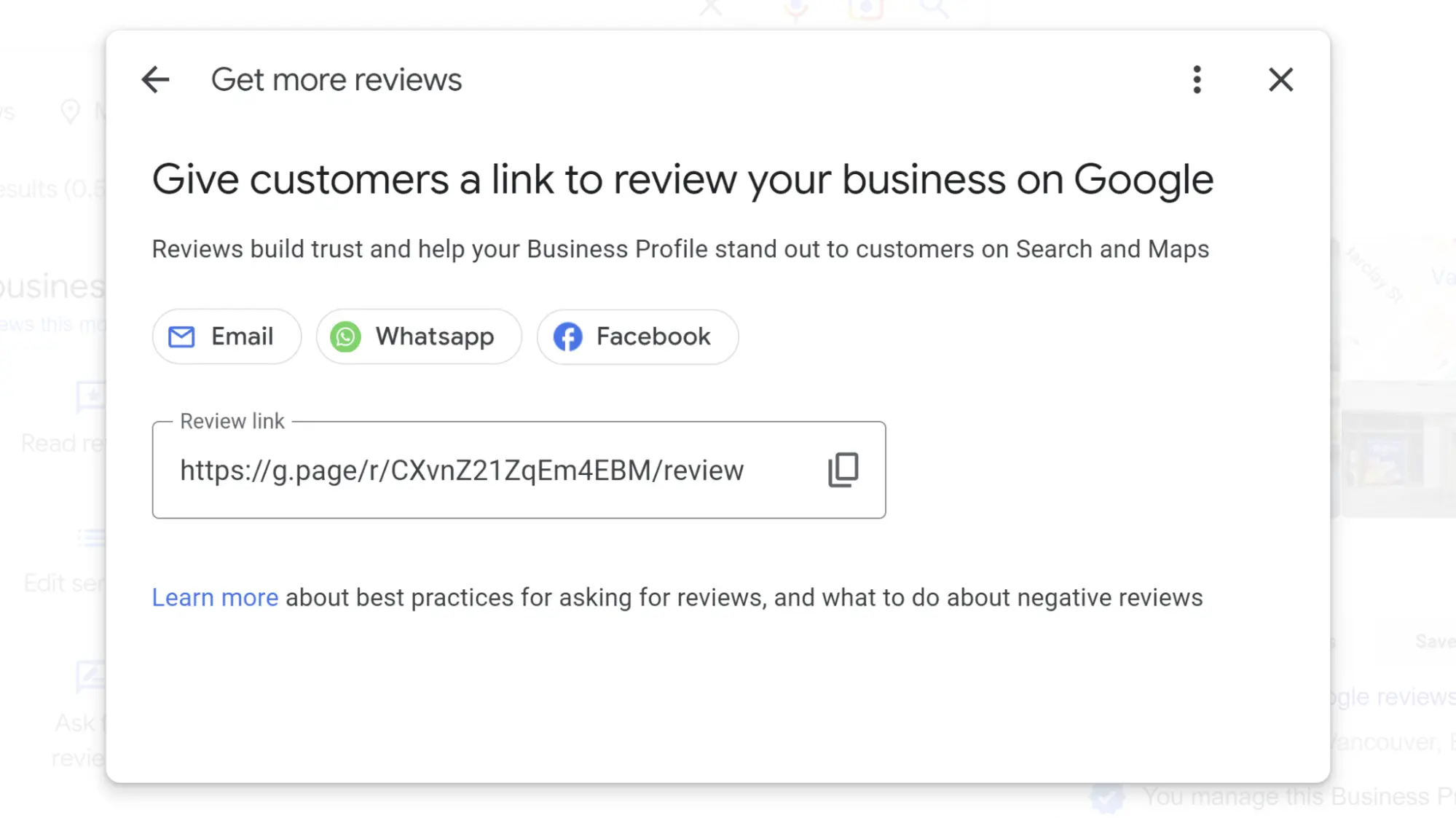 Clicking on the latter will take you to a popup that generates a handy link to your review profile, with prompts to share that link via vehicles like email, WhatsApp or Facebook: