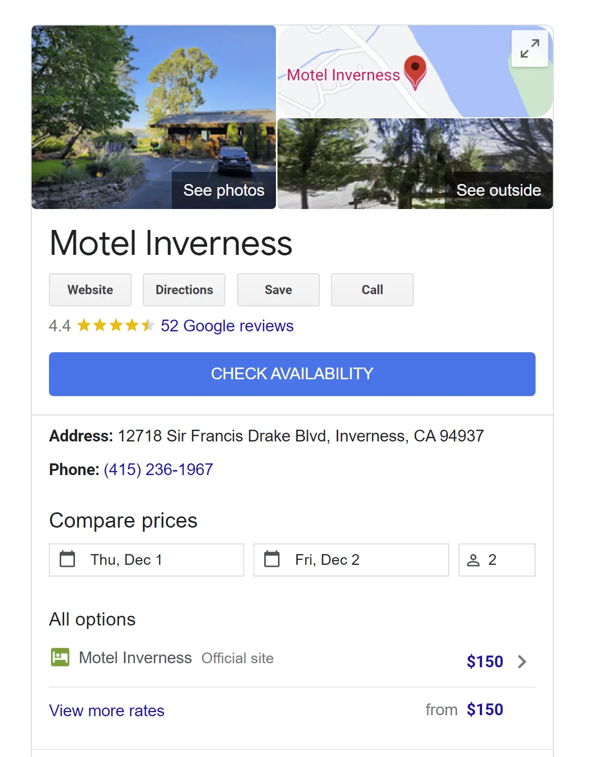 Hotel profiles are unique to the point of being almost a different style of Google listing. They feature many distinct elements including price comparison, environmental practices, availability-based booking, and other features.