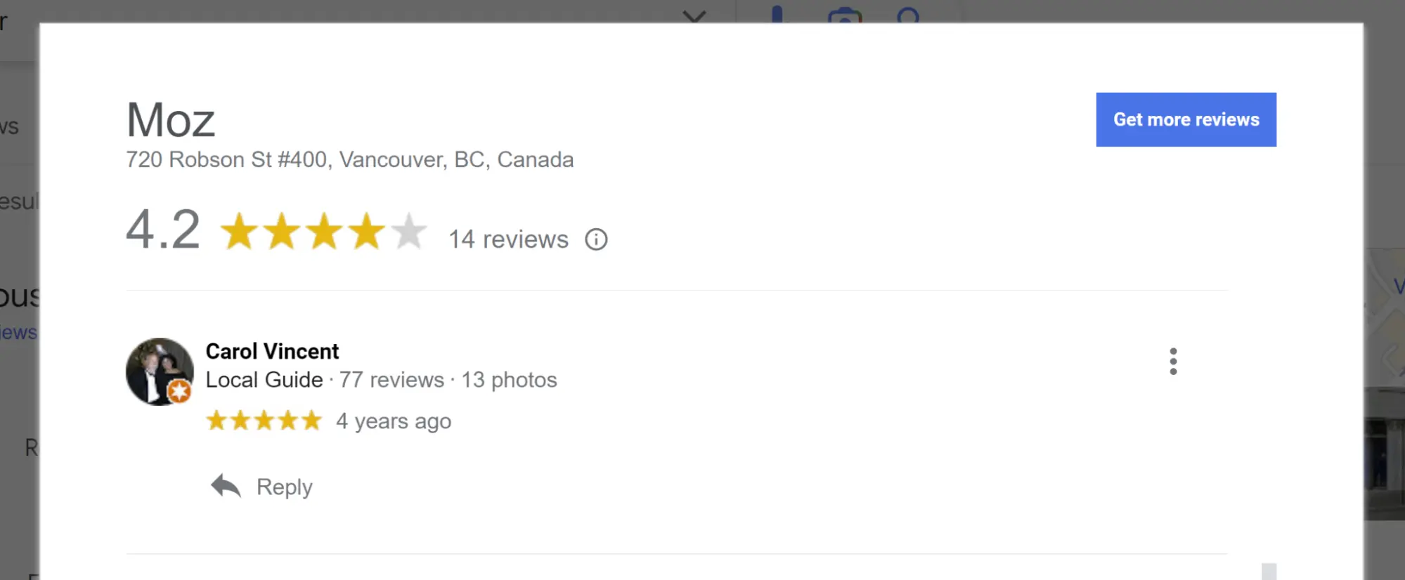 This is a simple count of the total number of Google-based reviews the business has received. Surveys indicate that consumers can become suspicious when any local business has either too few or too many reviews compared to its competitors. When clicked on, the review count takes the user to the main review overlay, which we will cover in full below.