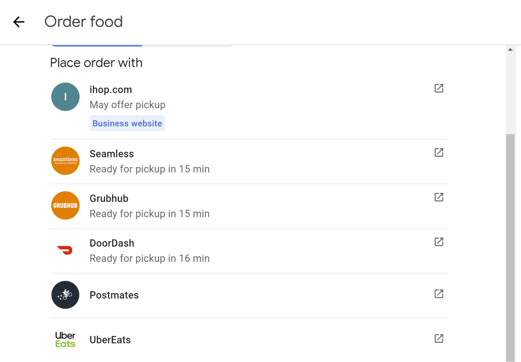 Some GBPs may feature an order online button . When clicked on, it brings up a list comprised of the brand as well as third-party services that facilitate taking digital payments in exchange for goods that can then be picked up or delivered.