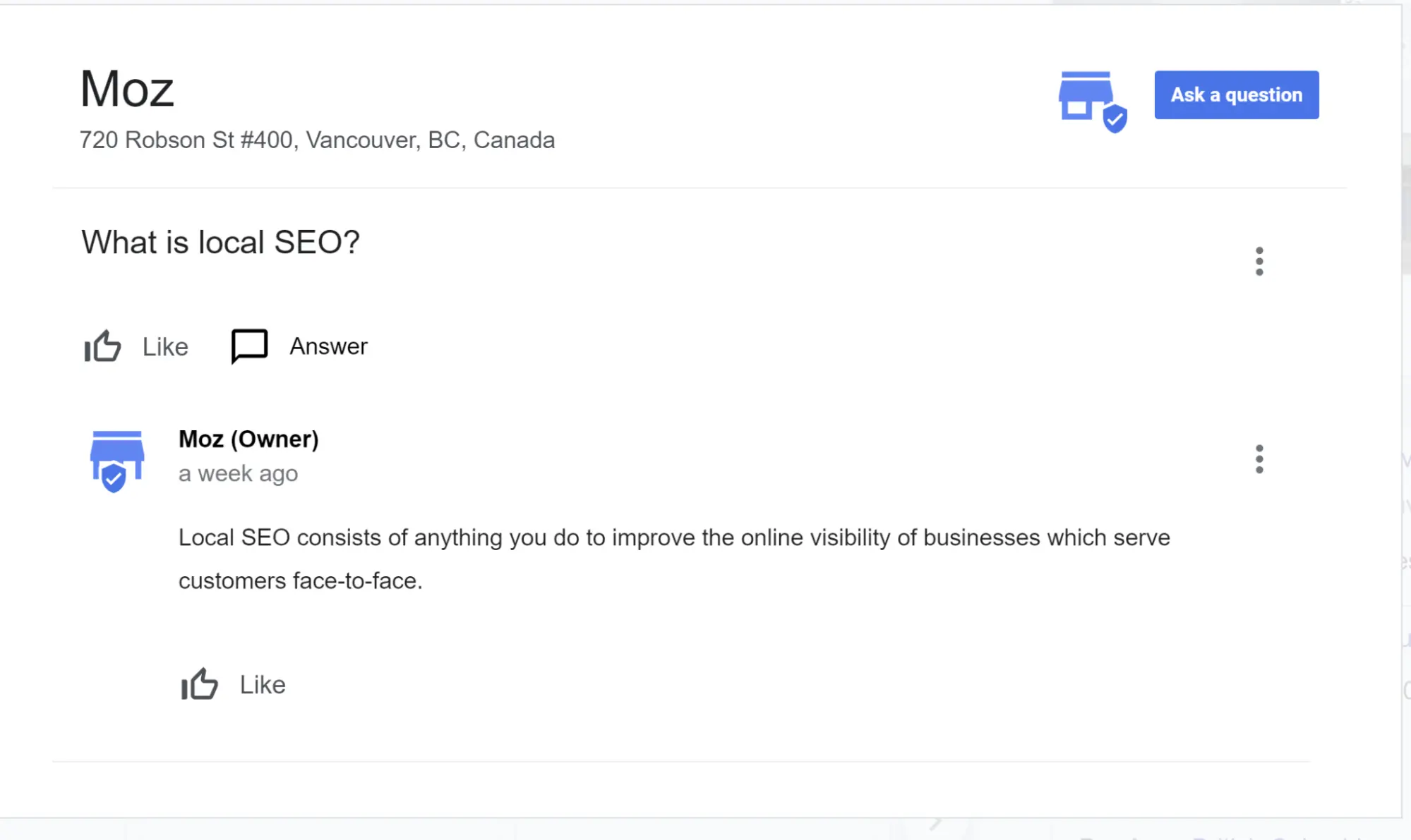 Businesses are permitted to use this feature to upload questions they commonly receive and answer them. The public can also ask questions and answer the queries others have submitted. It’s important to continuously monitor this area of the GBP to be sure that questions from the public are receiving timely, authoritative answers from your brand, rather than random answers from the public which may or may not accurately reflect the business.