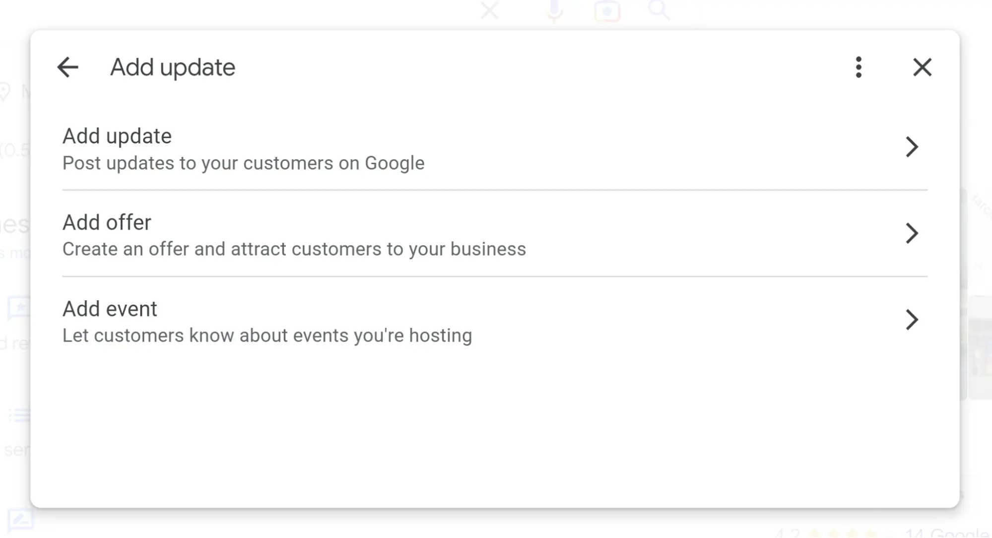 Click the “add update” link in the NMX and you’ll be shown three types of posts you can write: updates, offers, and events. The first lets you add an image, a description, and a linked button and will stay live for six months before being archived. The second includes all these fields, plus a date range setting for the period in which your offer is live, and additional informational fields to further explain the terms of your offer. The third type includes fields for information like when your event starts and ends. Some listings may also feature discontinued post types.