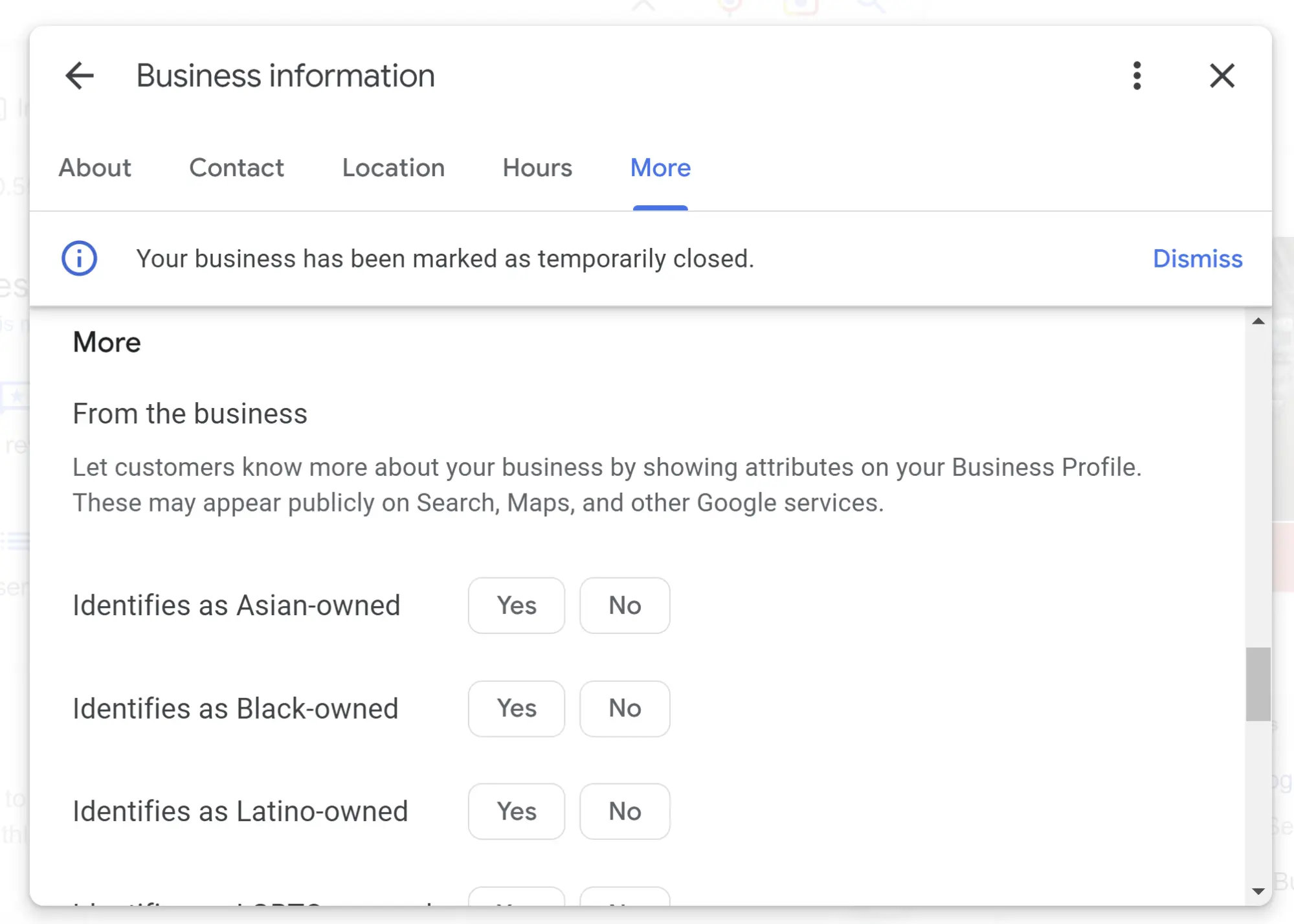 This is an experimental area of GBPs to which Google is always adding so that both businesses and the public can further define the characteristics of the business. Attributes can include information about who owns the business, or amenities, such as whether a building has gender-neutral restrooms, or protocols, such as whether an appointment is required to visit a business, or layout information, such as the presence of wheelchair-accessible entrances.