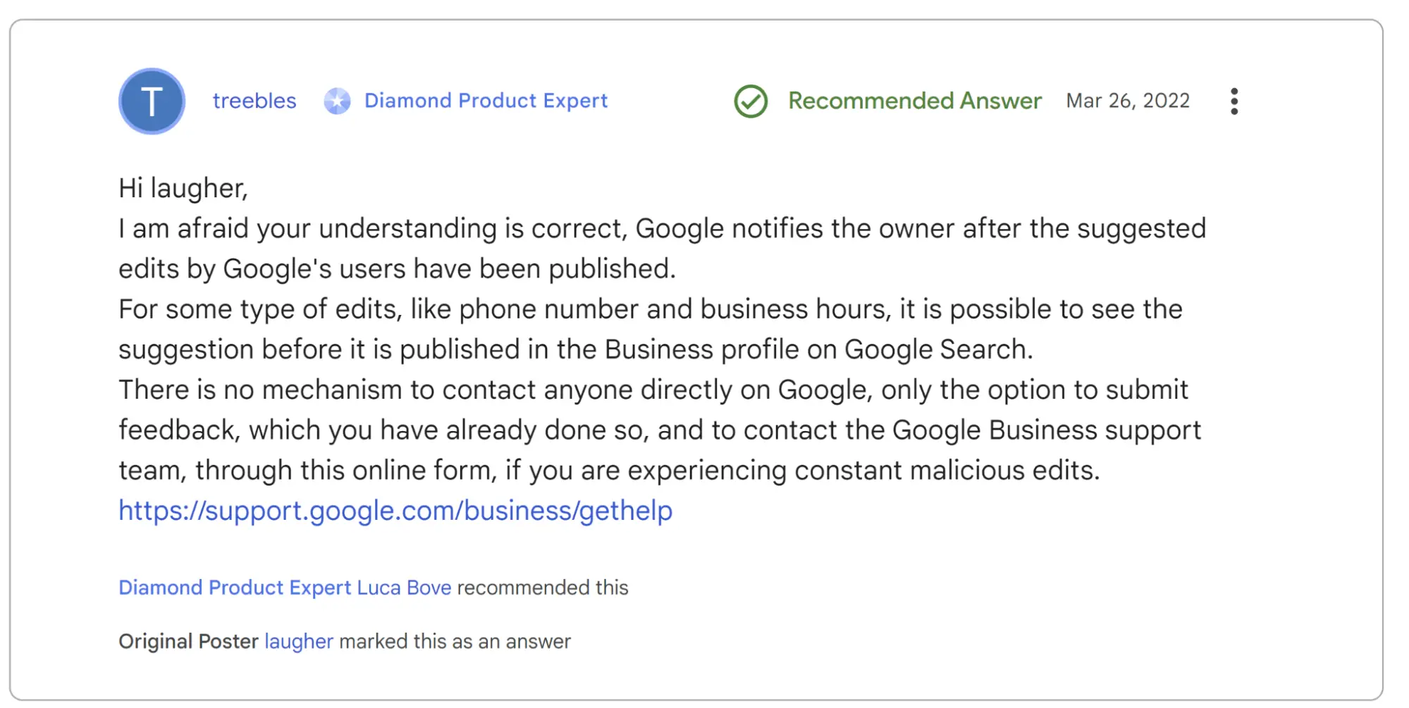 No. Unfortunately, the suggest an edit feature is a cause of confusion and stress for many local business owners who have no control over whether or not members of the public suggest edits to listings. The difficulty of the scenario is summed up well by this Diamond Product Expert in Google’s help forum: