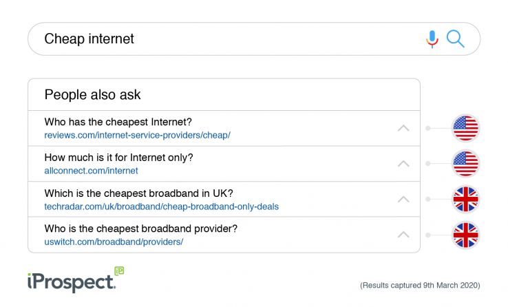 Although we see a majority of PAAs in this keyword category return UK results, there are quite a few more specific searches for which you would absolutely be looking for a UK result (e.g. “unlimited data phone contracts”) but that bring back only one UK result.