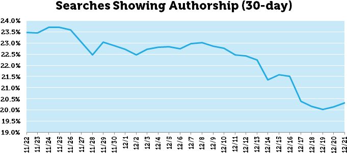 The graph shows the percentage of queries that displayed authorship mark-up (to any degree) on page 1 of Google (note: the Y-axis has been constrained to the range of the data). This data ranges from a peak of 23.71% on Nov. 24 to a low of 20.03% on Dec. 19, a relative drop of 15.5%.